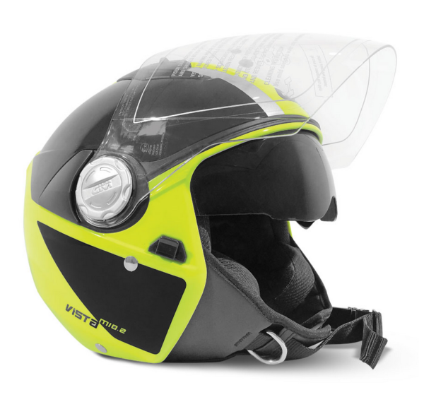 - Bên cạnh đó Nón bảo hiểm ¾ GIVI Vista có hệ thống 2 kính, một kính ngoài màu trong giúp chống bụi, đất đá,… kết hợp với một kính màu tối bên trong có thể bật lên /xuống nhanh chóng để bảo vệ mắt người đội khỏi tia UV khi đi dưới ánh nắng mặt trời, hay cần bật lên khi đi trong điều kiện thiếu ánh sáng như đi vào ban đêm.
